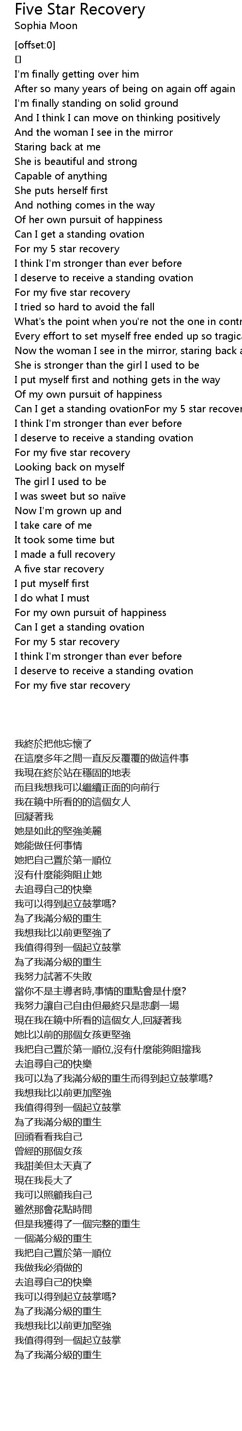 | [01:40.767] | Can I get a standing ovationFor my 5 star recovery |