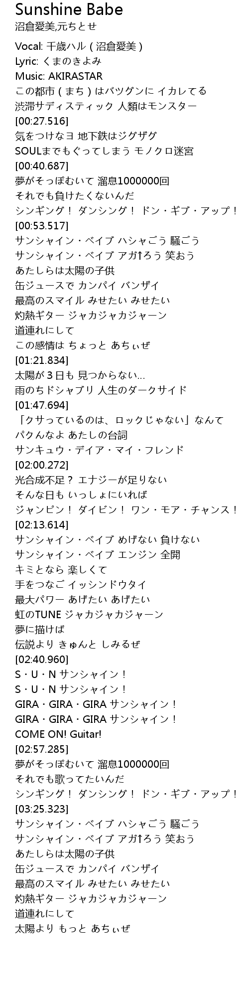 | [03:25.736] | サンシャイン・ベイブ ハシャごう 騒ごう |