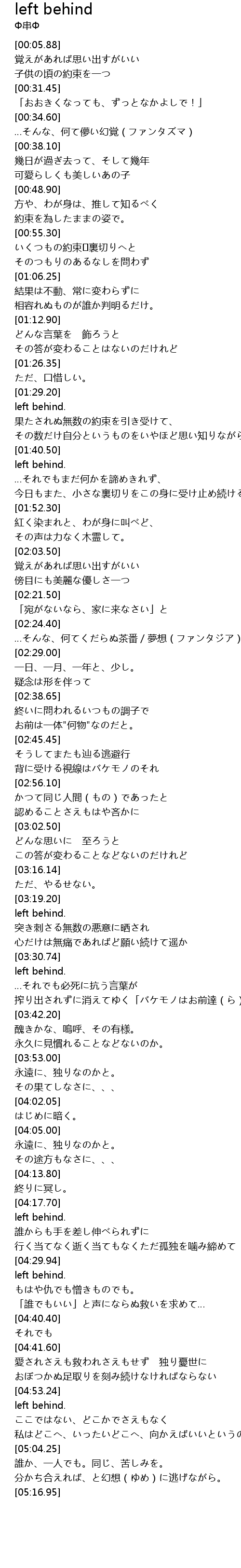 | [03:36.50] | 搾り出されずに消えてゆく「バケモノはお前達(ら)の方が!」と。 |