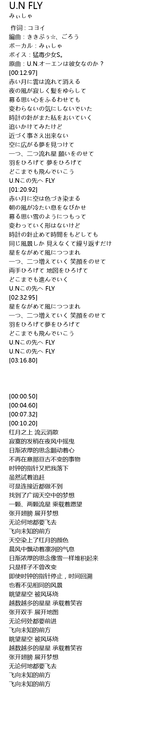 | [00:10.20] | yuán qǔ: U. N. bǐ nǚ? |