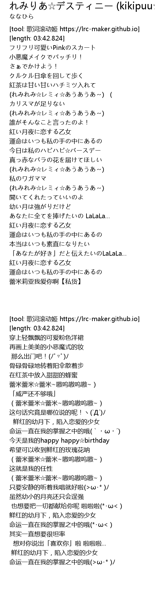 | [01:00.000] | (蕾米蕾米☆蕾米~嗷呜嗷呜嗷~) |