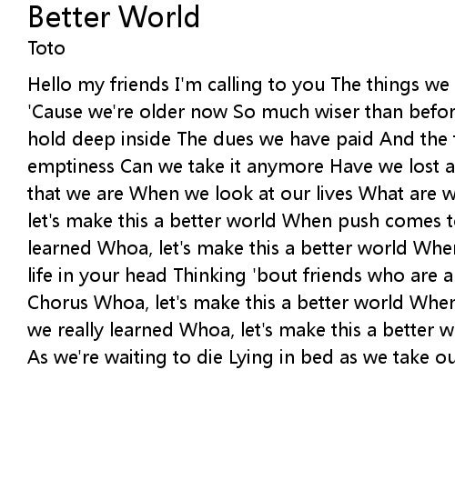 Hello my friends I'm calling to you The things we believed Are no longer true 'Cause we're older now So much wiser than before The pain that we've felt We hold deep inside The dues we have paid And the tears we have cried And the emptiness Can we take it anymore Have we lost all our faith in our God And all that we are When we look at our lives What are we fighting for Chorus Whoa, let's make this a better world When push comes to shove What have we really learned Whoa, let's make this a better world When you're lying awake with your life in your head Thinking 'bout friends who are already dead We can change Chorus Whoa, let's make this a better world When push comes to shove What have we really learned Whoa, let's make this a better world Is there hope for us all As we're waiting to die Lying in bed as we take our last sigh