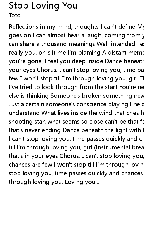 Reflections in my mind, thoughts I can't define My heart is racing and the night goes on I can almost hear a laugh, coming from your photograph Funny how a look can share a thousand meanings Well-intended lies, contemplating alibies Is it really you, or is it me I'm blaming A distant memory flashes over me Even though you're gone, I feel you deep inside Dance beneath the light with that look in your eyes Chorus: I can't stop loving you, time passes quickly and chances are few I won't stop till I'm through loving you, girl There's a window in a heart, I've tried to look through from the start You're never really sure what someone else is thinking Someone's broken something new, another altered point of view Just a certain someone's conscience playing I held it in my hand, I did not understand What lives inside the wind that cries her name Tried to catch a shooting star, what seems so close can't be that far I'm living in a dream that's never ending Dance beneath the light with that look in your eyes Chorus: I can't stop loving you, time passes quickly and chances are few I won't stop till I'm through loving you, girl (Instrumental break) Dancing with that look that's in your eyes Chorus: I can't stop loving you, time passes quickly and chances are few I won't stop till I'm through loving you, girl Chorus: I can't stop loving you, time passes quickly and chances are few I won't stop till I'm through loving you, Loving you...