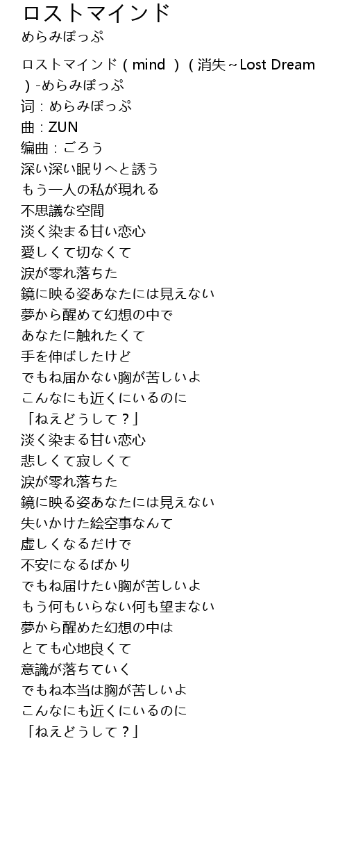 | [00:00.00] | ロストマインド(mind )(消失~Lost Dream )-めらみぽっぷ |