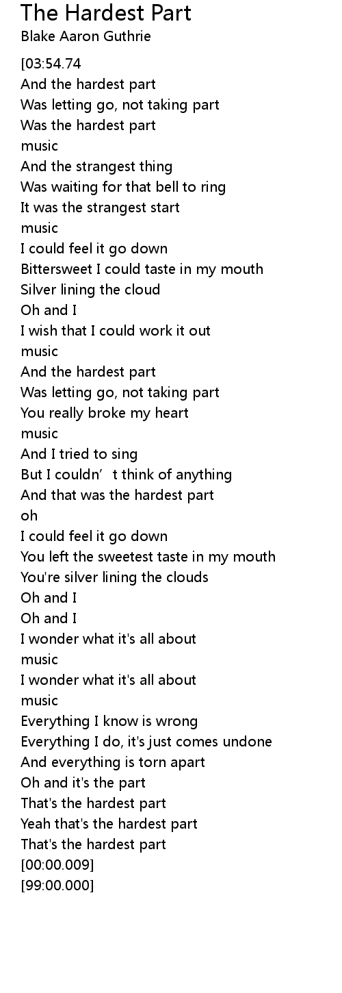 | [04:05.40][03:54.74][00:00.25] | The Hardest Part |