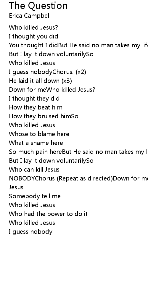 NOBODYChorus (Repeat as directed)Down for me (Repeat as directed)Who killed Jesus |