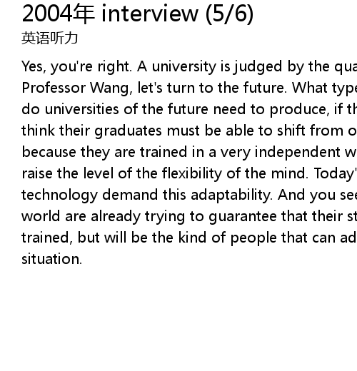 | Yes, you're right. A university is judged by the quality of education it offers. Professor Wang, let's turn to the future. What type of graduates, in your view, do universities of the future need to produce, if they are to remain relevant? I think their graduates must be able to shift from one profession to another, because they are trained in a very independent way. If you can do that, you raise the level of the flexibility of the mind. Today's rapid changes in technology demand this adaptability. And you see the best universities in the world are already trying to guarantee that their students will be technically trained, but will be the kind of people that can adapt to any change in situation. |