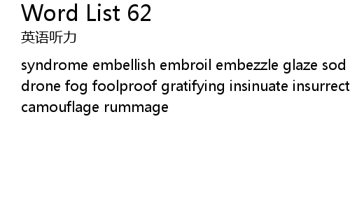 syndrome embellish embroil embezzle glaze sod impinge impotent unfathomable drone fog foolproof gratifying insinuate insurrection involuntary smother camouflage rummage