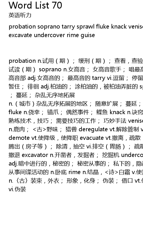 | probation n.试用(期); 缓刑(期); 查看,查验; 试读(期) soprano n.女高音; 女高音歌手; 唱最高音者; 高音部 adj.女高音的; 最高音的 tarry vi.逗留; 停留; 暂住; 徘徊 adj.柏油的; 涂柏油的,被柏油弄脏的 sprawl vi.伸开四肢坐[躺]; 蔓延; 杂乱无序地拓展 n.(城市)杂乱无序拓展的地区; 随意扩展; 蔓延; 蔓延物 fluke n.侥幸; 锚爪; 偶然事件; 鲽鱼 knack n.诀窍,窍门; 熟练技术,技巧; 需要技巧的工作; 巧妙手法 venison n.鹿肉; <古>野味; 猎兽 deregulate vt.解除管制 vi.解除控制 demote vt.使降级,使降职 evacuate vt.撤离,疏散; 排泄; 腾出(房子等); 除清,抽空 vi.排空(胃肠); 疏散; 撤退 excavator n.开凿者,发掘者; 挖掘机 undercover adj.暗中进行的,秘密的; 秘密从事的; 私下的,隐蔽的; 从事间谍活动的 n.卧底 rime n.结晶,<诗>白霜 v.使蒙霜 guise n.〈古〉装束,外衣; 形象,化身; 伪装; 借口 vt.使化装 vi.伪装 |