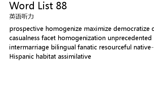| prospective homogenize maximize democratize donate uniformity discourse casualness facet homogenization unprecedented incessant assimilation intermarriage bilingual fanatic resourceful native-born hack foreign-born Hispanic habitat assimilative |