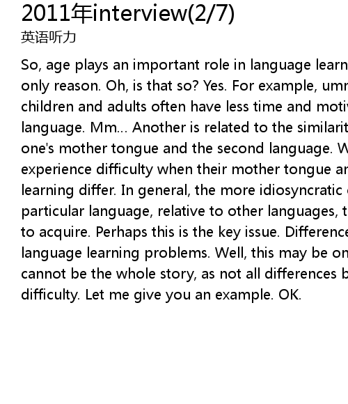 | So, age plays an important role in language learning? Yes. But that' s not the only reason. Oh, is that so? Yes. For example, umm, time and interest. Old children and adults often have less time and motivation to learn a second language. Mm Another is related to the similarities and differences between one' s mother tongue and the second language. We find that learners will experience difficulty when their mother tongue and the second language they are learning differ. In general, the more idiosyncratic or feature is in a particular language, relative to other languages, the more difficult it will be to acquire. Perhaps this is the key issue. Differences between languages cause language learning problems. Well, this may be one of the issues here, but this cannot be the whole story, as not all differences between languages cause difficulty. Let me give you an example. OK. |