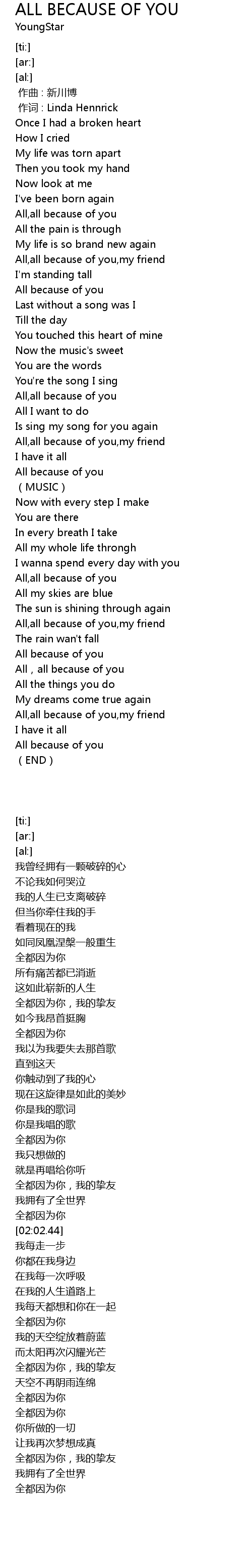 | [03:04.63] | All, all because of you |