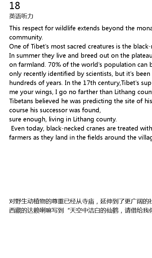 | 对野生动植物的尊重已经从寺庙,延伸到了更广阔的社会中西藏最神圣的一种动物是黑颈鹤夏季它们在高原上繁衍生息冬天它们聚集在农田里世界上70%的黑颈鹤都生活在这里尽管科学家最近才识别出了这种生物但是西藏人熟识它们已经有了几百年在17世纪 西藏的达赖喇嘛写到“天空中洁白的仙鹤,请借给我你的双翅,我不飞往远处,只到理塘就回”西藏人相信他在预言转世的地点在适当的时候,可以找到他的继承者当然继承者一定生活在理塘即使在今天,黑颈鹤落在村庄附近的农田时农民都会尊敬地欢迎它们的到来 |