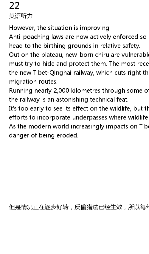 | 但是情况正在逐步好转,反偷猎法已经生效,所以每年夏天,母藏羚羊可以相对安全地带领羊群到繁衍的地方。所以母藏羚羊必须把他们藏起来保护它们。藏羚羊最近遇到的最大问题就是青藏铁路的修建正好阻断了它们传统的迁徙路线。青藏铁路蜿蜒2000多公里,经过世界上最高的地带,它的建造技术是震惊世界的壮举。评论它对野生动物的影响还为时过早,但工程师们已经设计了高架桥来让野生动物能安全地穿过铁路。由于现代世界对西藏与日俱增的影响,西藏的传统文化正面临影响。 |