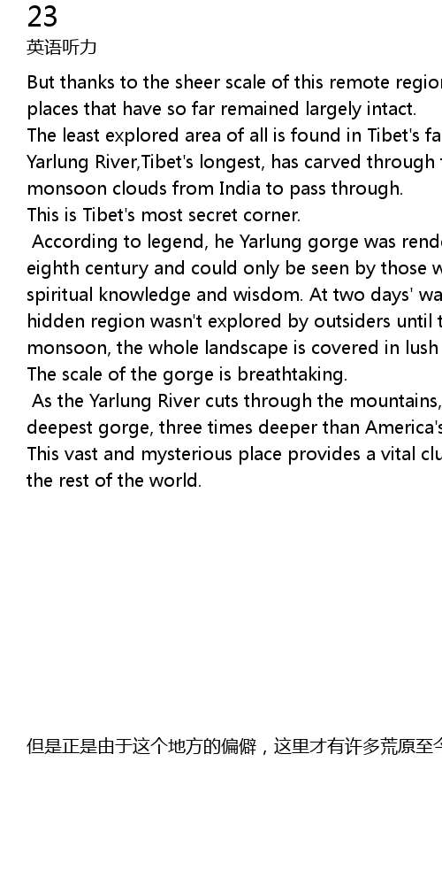| dan shi zheng shi you yu zhe ge di fang de pian pi, zhe li cai you xu duo huang yuan zhi jin reng bao liu zhe wei bei ren lei kai ken de zi ran zhuang tai. zui shao bei tan suo de di yu zai xi zang pian yuan de dong nan bu, xi zang zui zhang de ya lu cang bu jiang. zai xi ma la ya shan mai zhong liu xia le shen shen de yin ji, shi de cong yin du lai de yu ji yun ke yi cong zhong chuan guo. zhe li shi xi zang zui shen mi de jiao luo, gen ju chuan shuo ya lu cang bu jiang da xia gu, zai shi ba shi ji qi ji ban di xiao shi le. zhi you nei xie ju you gao shang pin de he cong ming cai zhi de ren cai neng kan dao, zhe ge shen mi de di fang li zui jin de lu you liang tian de lu cheng, zhi dao 20 shi ji 90 nian dai cai bei shi ren fa xian. duo kui le ji feng de bang zhu, cai shi zhe ge di fang cang cui fan mao. xia gu zhi da rang ren xin jing dan zhan, ya lu cang bu jiang cong shan luan jian chuan guo, xing cheng le shi jie zui shen de xia gu, bi mei guo da xia gu shen san bei duo. zhe ge guang mao shen mi de di fang wei yan jiu xi zang, dui qi ta di fang de zhong yao xing ti gong le ji qi zhong yao de xian suo. |