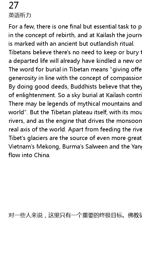 | 对一些人来说,这里只有一个重要的终极目标。佛教徒相信有轮回,认为在卡伊拉什山,从今生到来世的路上,都有古代神秘仪式的印迹。西藏人认为没有必要保存或埋葬他们的尸体,因为死亡的人已经在其他地方获得了新生。藏语中的埋葬的意思是“施舍喂鸟,这种行为和他们怜悯一切生灵的观念是一致。佛教徒相信行善有益于他们的教化,所以在卡伊拉什天葬能获得更好的未来。或许世界屋脊由关于山的神话和河流构成。但是青藏高原本身,还有它的山峦、冰川、河流。作为季风的推动者,是名副其实的世界屋脊。除了是印度和巴基斯坦的源头,西藏的冰川还是更多主要河流的源头。越南的湄公河,缅甸的怒江雅鲁藏布江和黄河,都流经中国。 |