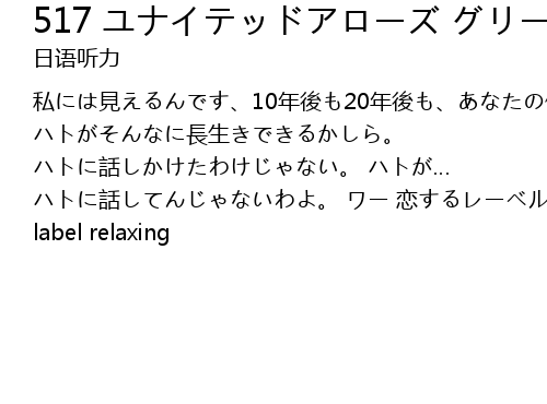 | 私には見えるんです、10年後も20年後も、あなたの傍に私がいる。 ハトがそんなに長生きできるかしら。 ハトに話しかけたわけじゃない。 ハトが… ハトに話してんじゃないわよ。 ワー 恋するレーベル green label relaxing |