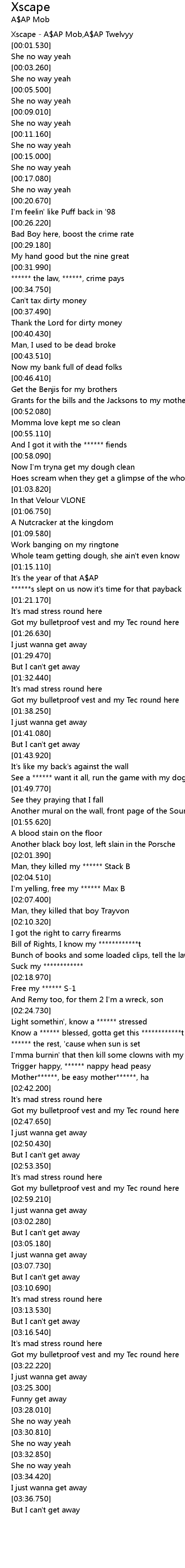 | [00:00.290] | Xscape - A$AP Mob,A$AP Twelvyy |