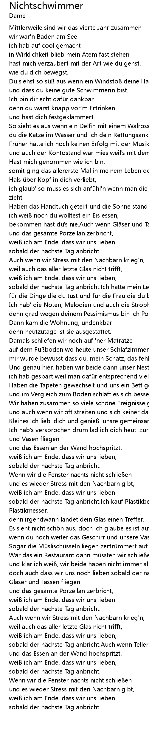 | doch auch dass wir uns noch lieben sobald der nächste Tag anbricht.Auch wenn Gläser und Tassen fliegen | |