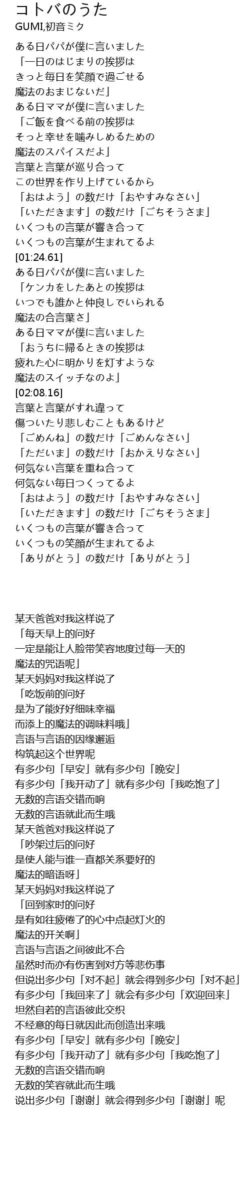 | [02:38.63] | 「ただいま」の数だけ「おかえりなさい」 |