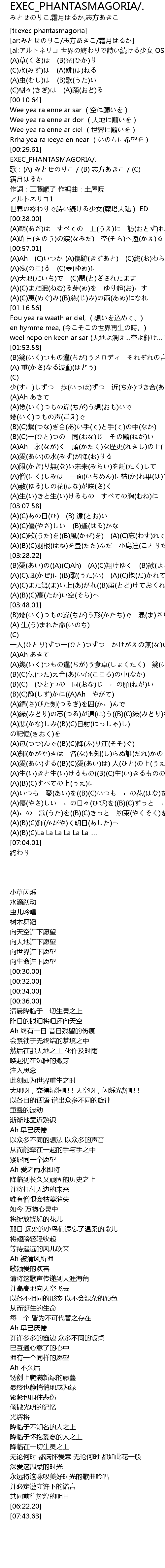 | [00:36.00] | アルトネリコ1 世界の終わりで詩い続ける少女(魔塔大陆) ED |