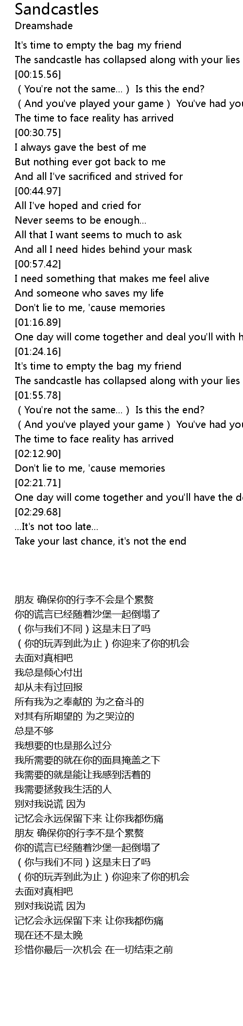 | [01:53.41] | 你的谎言已经随着沙堡一起倒塌了 |