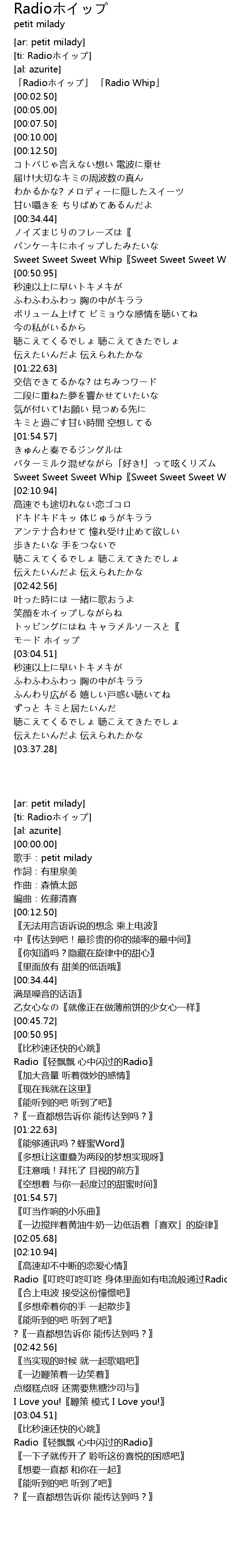 | [00:00.00] | 「Radioホイップ」 「Radio Whip」 |