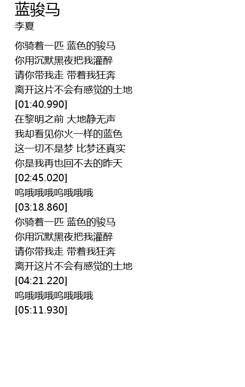 | [03:52.370] | 你骑着一匹 蓝色的骏马 |