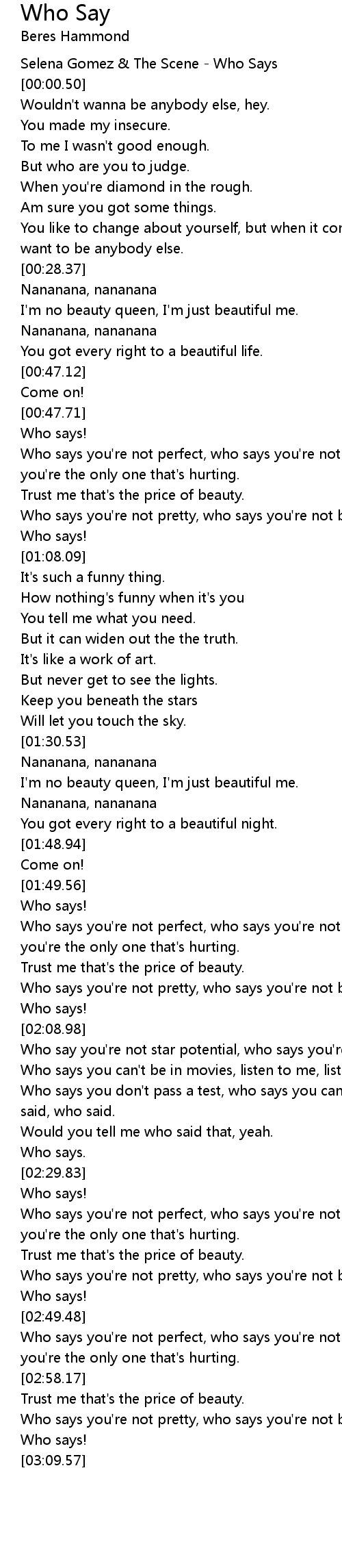 Who says you're not perfect, who says you're not worth it. Who says you're the only one that's hurting. |