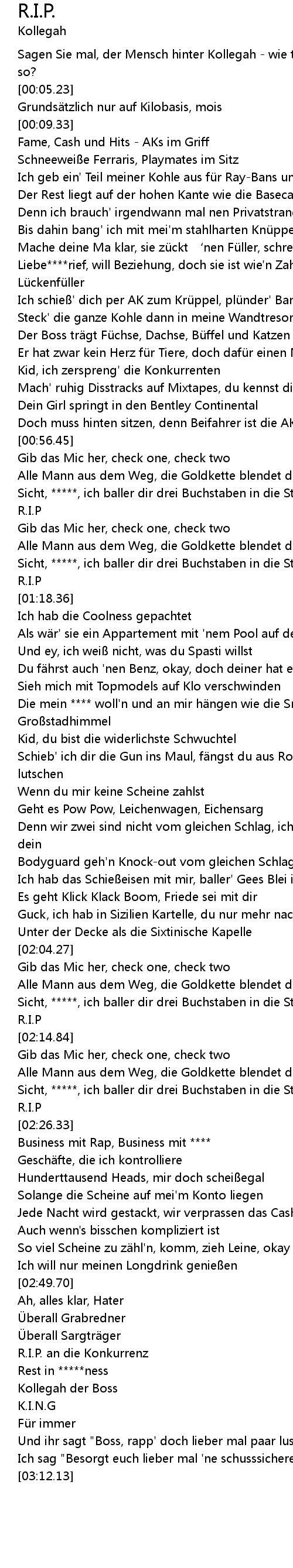 | [00:02.28] | Sagen Sie mal, der Mensch hinter Kollegah - wie tickt der eigentlich so? |