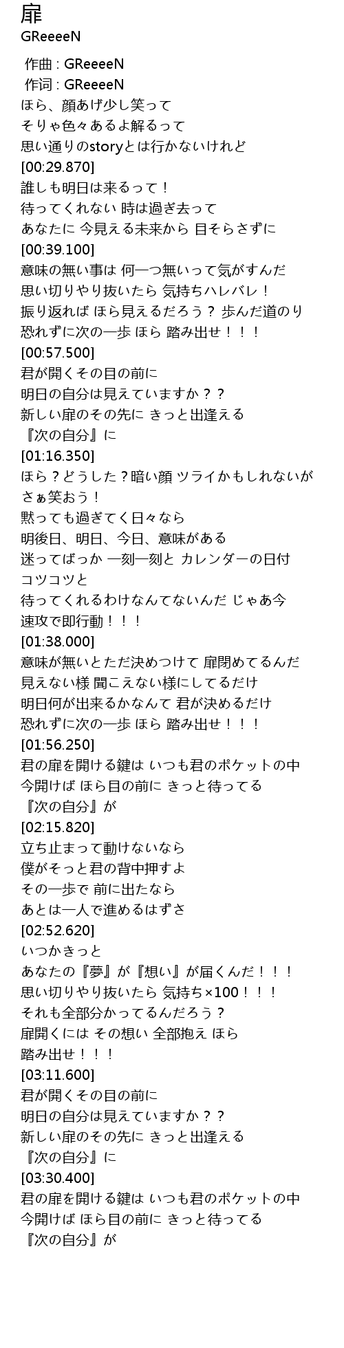 | [03:30.520] | 君の扉を開ける鍵は いつも君のポケットの中 |