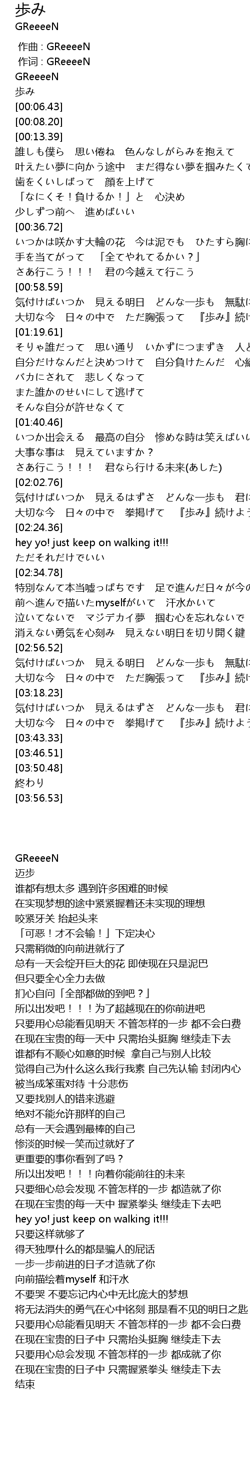 | [03:29.54] | 大切な今 日々の中で 拳掲げて 『歩み』続けよう |