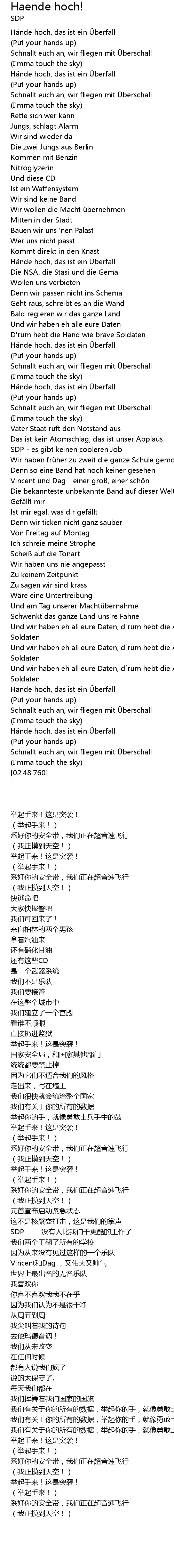 | [02:22.840] | Und wir haben eh all eure Daten, d rum hebt die Arme wie brave Soldaten |