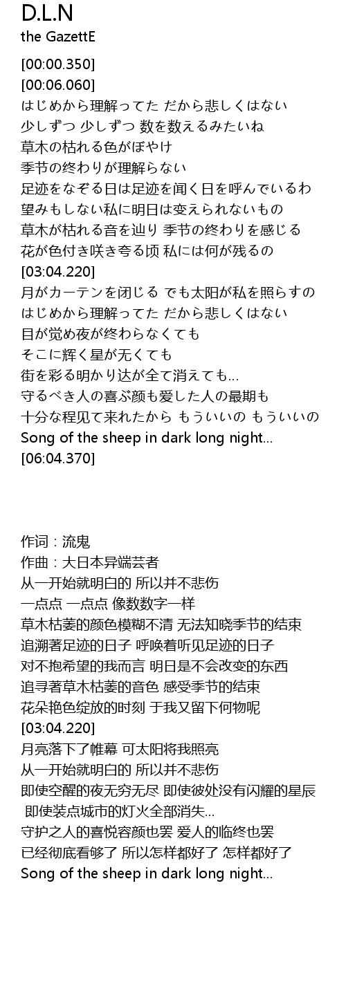 | [01:18.270] | 草木の枯れる色がぼやけ 季节の终わりが理解らない |