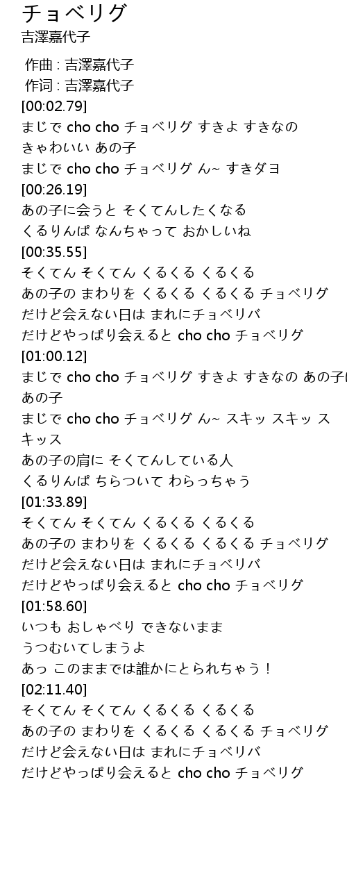 | [00:14.61] | まじで cho cho チョベリグ すきよ すきなの きゃわいい あの子 |