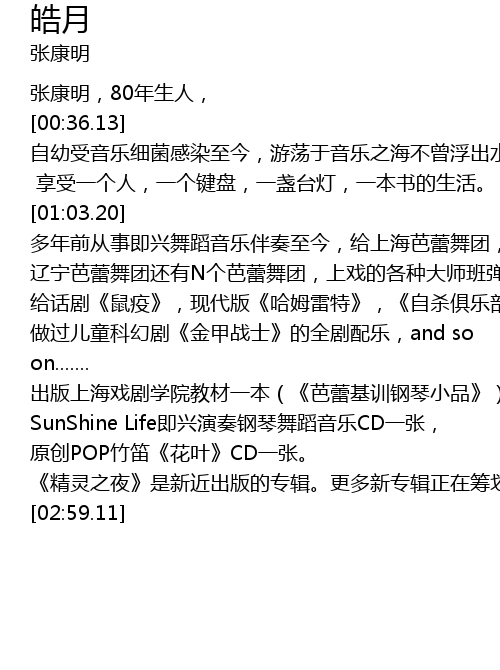 [01:03.20] 多年前从事即兴舞蹈音乐伴奏至今,给上海芭蕾舞团,香港芭蕾舞团,
