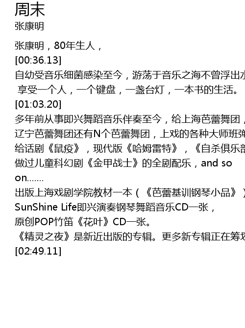 | [01:03.20] | 多年前从事即兴舞蹈音乐伴奏至今,给上海芭蕾舞团,香港芭蕾舞团, |