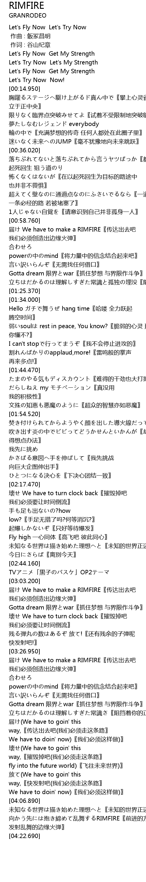 | [04:15.360] | 向かう先には抱き締めて乱舞するRIMFIRE〖前进的方向胸怀大志 发射乱舞的边缘火弹〗 |