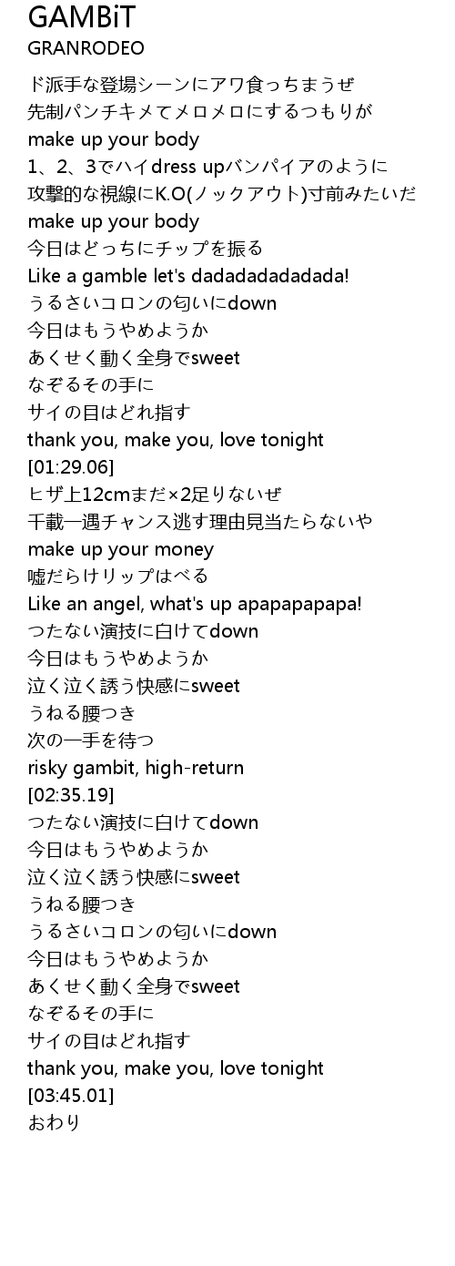 | [01:02.94] | Like a gamble let's dadadadadadada! |