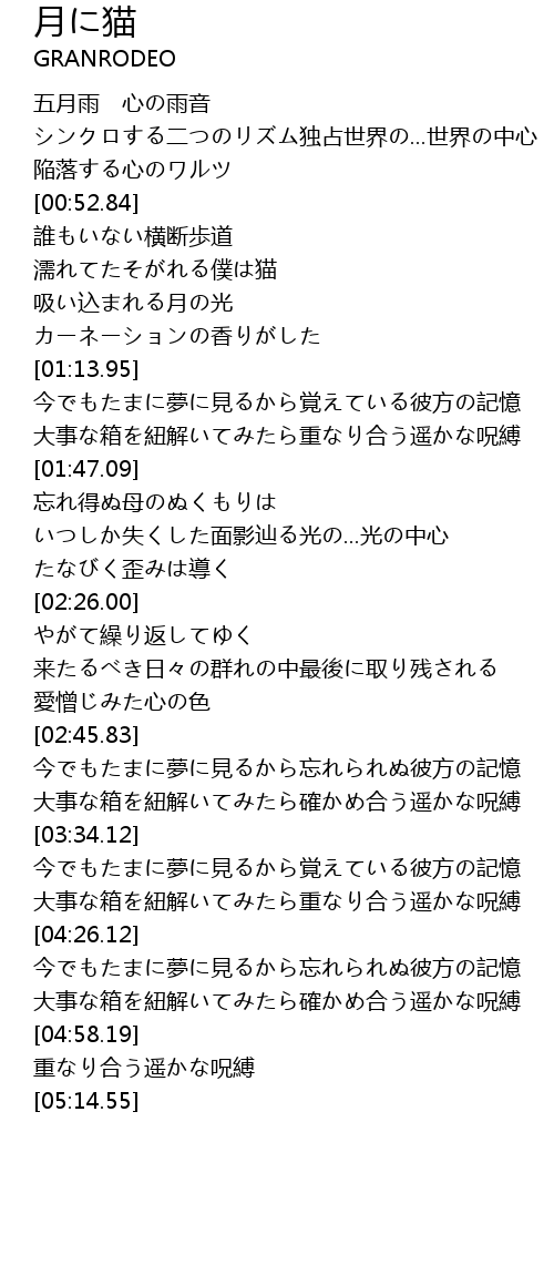 | [00:58.21] | 濡れてたそがれる僕は猫 |