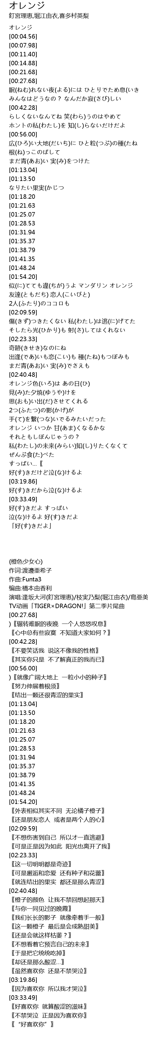 | [03:37.31][01:13.50] | オレンジ色(いろ)に 早(はや)く なりたい果実(かじつ |