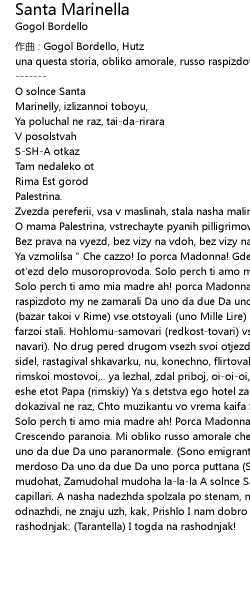| Ya vzmolilsa " Che cazzo! Io porca Madonna! Gde tletvorniy pod' ezd, ili etot ot' ezd delo musoroprovoda. Solo perch ti amo mia madre ah! Crescendo paranoia. Solo perch ti amo mia madre ah! porca Madonna. My obliko russo amorale chest raspizdoto my ne zamarali Da uno da due Da uno da stronzo puttana Na Americana bazar takoi v Rime vse. otstoyali uno Mille Lire Poeti, yuristi, mediki vse farzoi stali. Hohlomusamovari redkosttovari vse fuflo tolkali krutiye navari. No drug pered drugom vsezh svoi otjezd opravdali: Ya na Piazza Navona, sidel, rastagival shkavarku, nu, konechno, flirtoval, no i semye pomogal A ya na rimskoi mostovoi,.. ya lezhal, zdal priboj, oioioi, Ya tak prosil pit, a tut eshe etot Papa rimskiy Ya s detstva ego hotel zamochit O carabiniery, ya vam dokazival ne raz, Chto muzikantu vo vrema kaifa Smotret nuzhno prjamo v glaz Solo perch ti amo mia madre ah! Porca Madonna. Solo perch ti amo mia madre ah! Crescendo paranoia. Mi obliko russo amorale chest raspizdoto my ne zamarali Da uno da due Da uno paranormale. Sono emigranto Da uno da due Da uno stronzo merdoso Da uno da due Da uno porca puttana Spoken: Prekranaya nas I ihto mudohat, Zamudohal mudoha lalala A solnce Santa Marinelli Vgrizalos nam v capillari. A nasha nadezhda spolzala po stenam, muh ne otgonaya, No vot kakto odnazhdi, ne znaju uzh, kak, Prishlo I nam dobro izza okeana, I togda, na rashodnjak: Tarantella I togda na rashodnjak! |