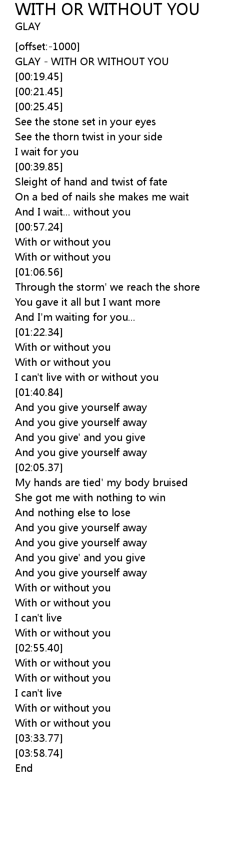 | [00:00.00] | GLAY - WITH OR WITHOUT YOU |