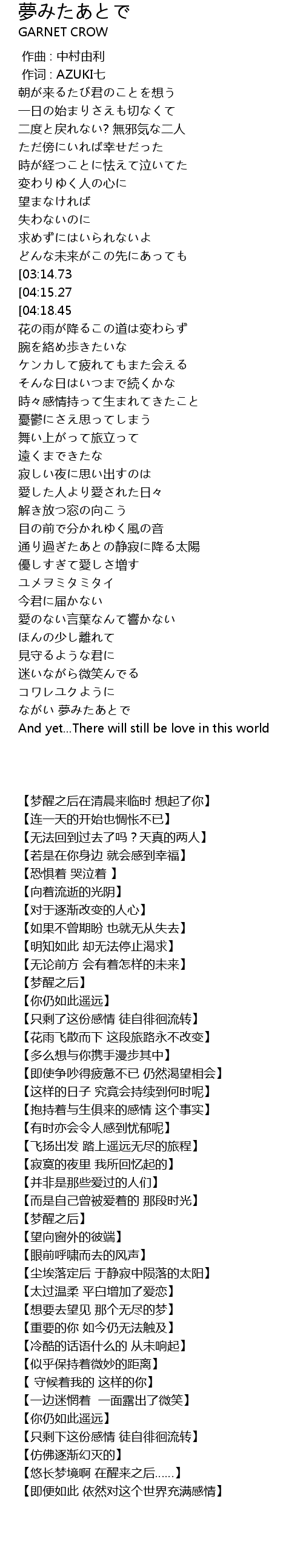 | [01:31.16][03:14.73] | ユメヲミタアトデ |