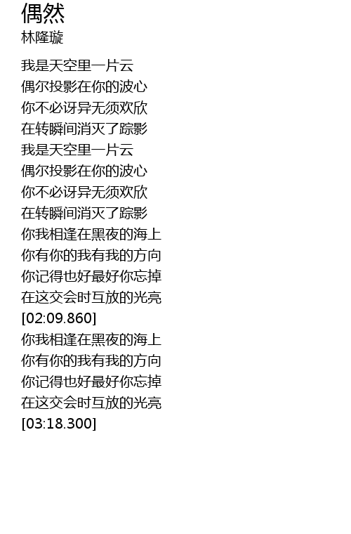 | [00:20.700] | wǒ shì tiān kōng lǐ yī piàn yún |