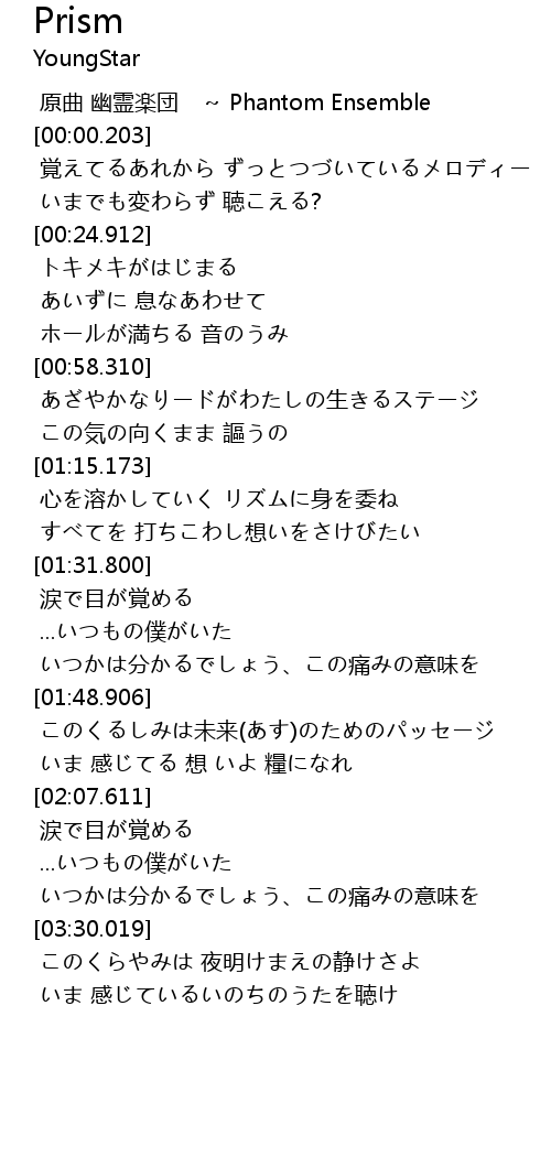 | [00:00.006] | 原曲 幽霊楽団 ~ Phantom Ensemble |