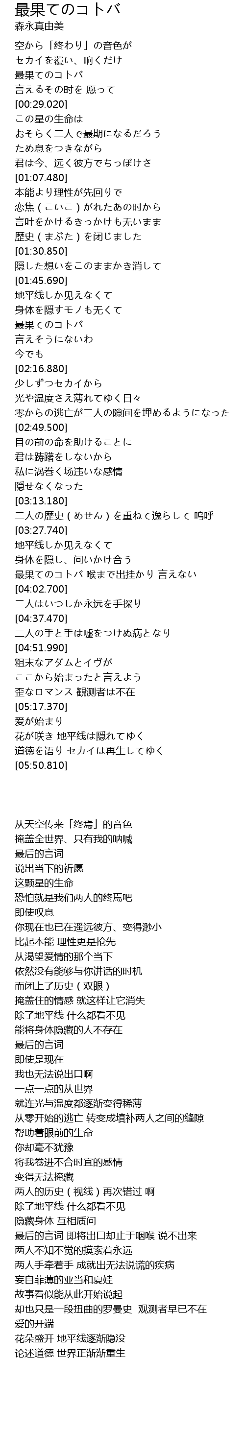 | [03:43.790] | 最果てのコトバ 喉まで出挂かり 言えない |