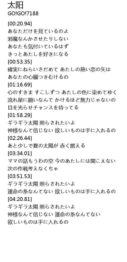| [03:57.17] | ギラギラ太陽 照らされたいよ |