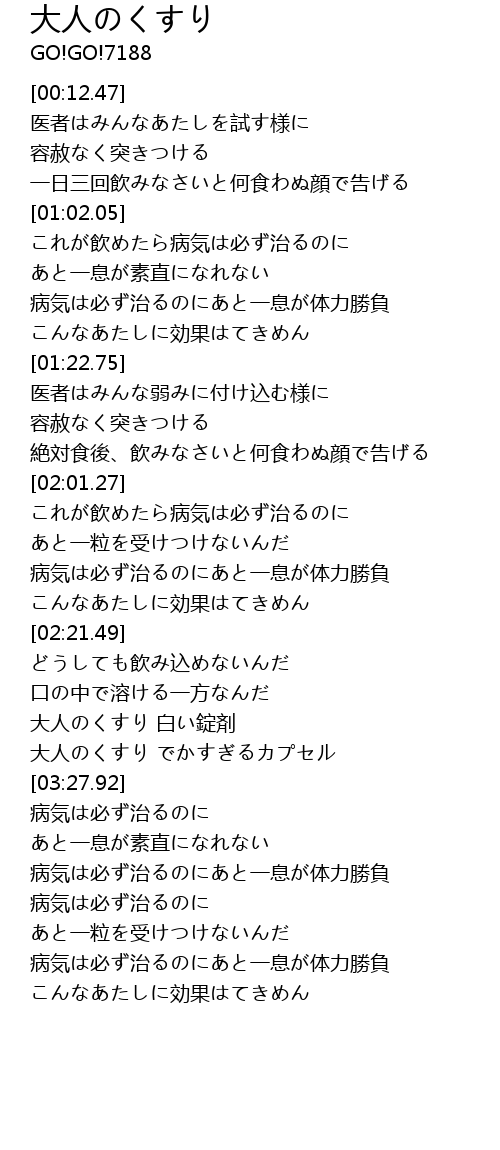 | [03:14.83] | 大人のくすり 白い錠剤 |
