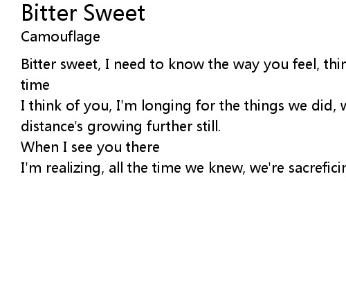 | Bitter sweet, I need to know the way you feel, things have changed, but all the time | |